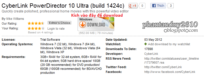 Bạn tải file cài đặt phần mềm CyberLink PowerDirector phiên bản 10.0.0.1424c tại trang web này